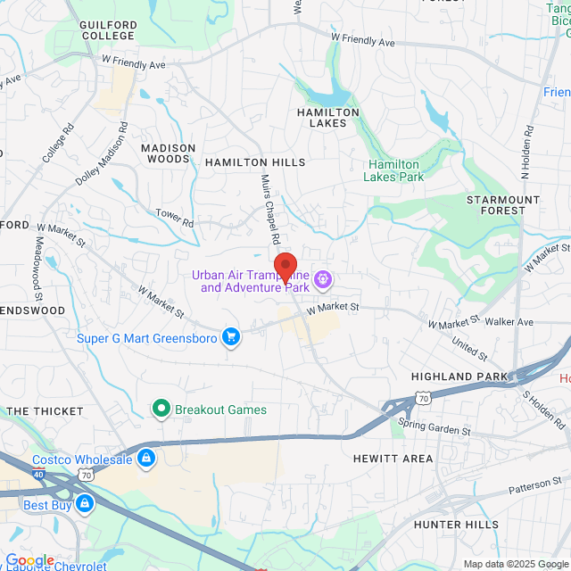 Our office is a house on the corner of Muirs Chapel and Westwood Rds; please park in the back, and use the walkway to the front door.